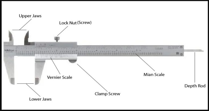 Secara garis besar, vernier caliper terdiri dari dua bagian yaitu rahang tetap dan rahang geser. Masing-masing bagian tersebut terdiri dari berbagai bagian lainnya, yang memiliki tujuan khusus. Di antaranya adalah: